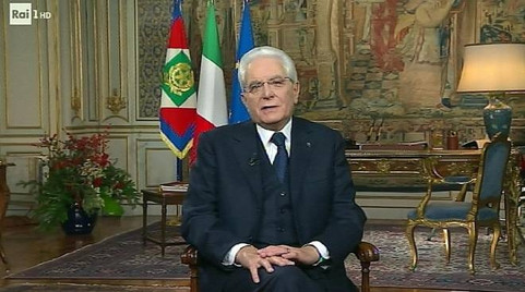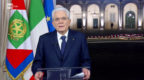 Discorsi di fine anno, 2019 e 2020, del Presidente della Repubblica. Dalla location dello studio interno si è passati all'immagine del cortile del Quirinale, proiettata alle spalle di Mattarella. Non più una pacata posa salottiera e colloquiale, il presidente è in piedi. Piglio deciso, trasmette attivismo e vigilanza a un popolo gravato dalle restrizioni e dalle perdite umane dovute al contagio da coronavirus. Leggermente decentrato sulla sinistra concede a tutti di prendere una boccata d'aria all'esterno, pur nei limiti imposti dall'aria cortilizia della casa degli italiani. Con le mani poggiate sul leggio di un podio in plexiglass che non svolge però la sua funzione, rendendo, per questo, più evidente la lettura dal gobbo resa con una moderata concitazione.